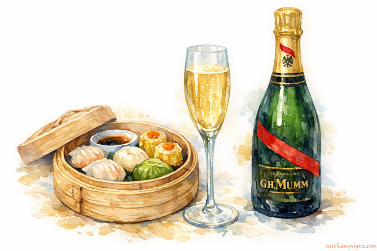蒸点的鲜甜是早茶的灵魂,经不起重橡木或重酵母的压制。白中白香槟(100%霞多丽)的柑橘、白花与矿物感,像给虾饺镀了一层光——鲜味被托起,而非掩盖。